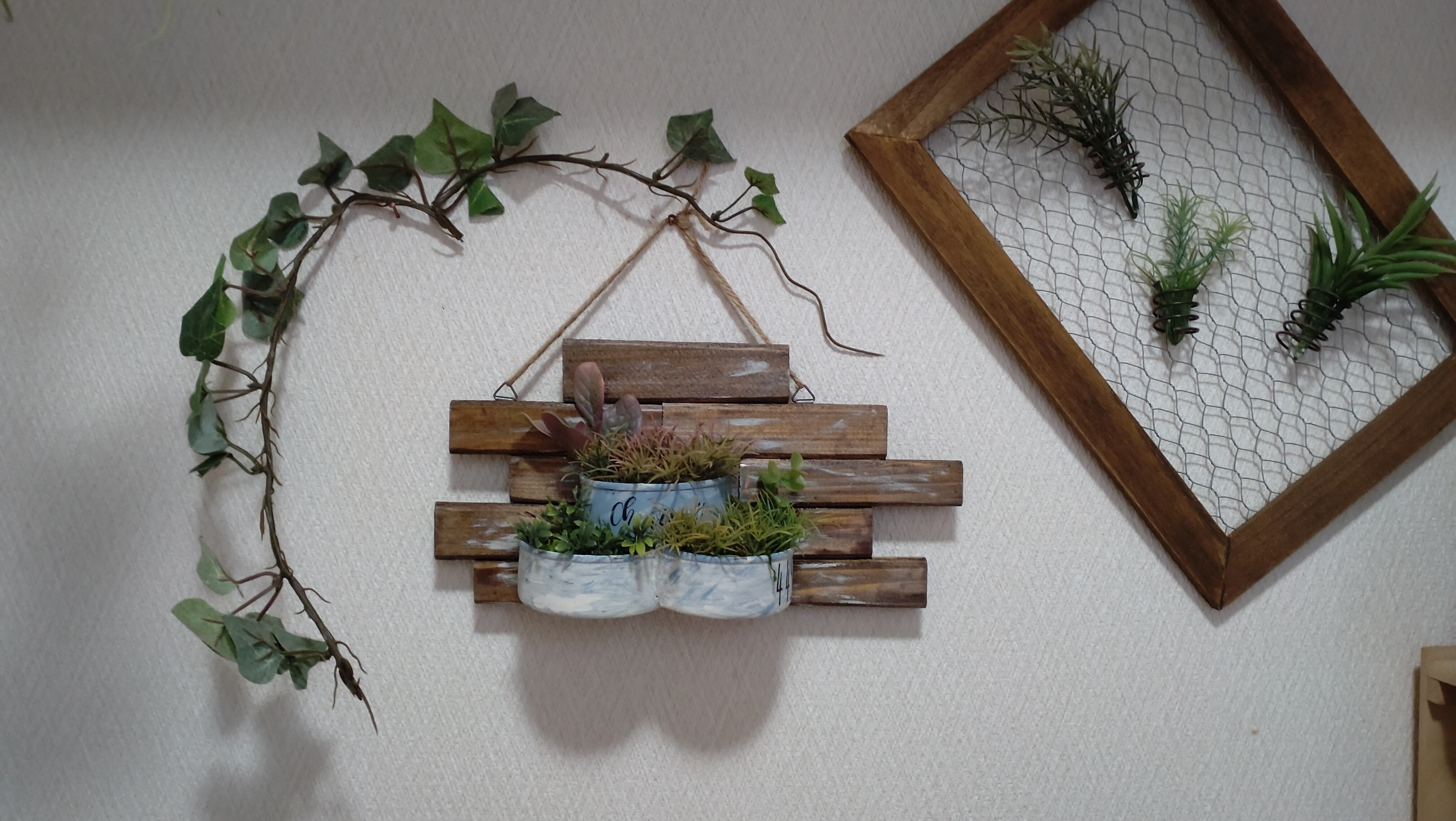 木製の壁をバックにジオラマ風に仕上げたフェイクグリーンです。